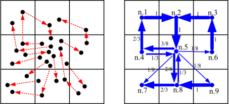 Fig. 2. Example of the modeling of travel flows: (a) raw taxi trajectory data, (b) spatially embedded flow network with edge weight (arrows’ thickness) equal to corresponding probabilities of movement between sub-regions.