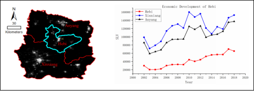 Fig.3. (a) is the geographical position of Hebi and its surrounding cities, (b) is the economic development conditions of these cities from 2002 to 2018.